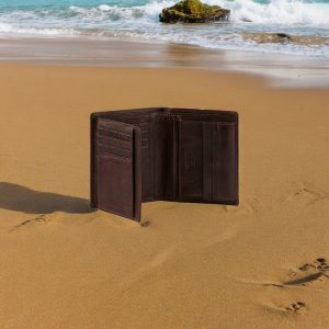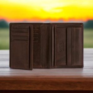 Όρθιο πορτοφόλι camel active Dust από γνήσιο δέρμα σε σκούρο καφέ χρώμα, με RFID προστασία, πολλές θήκες καρτών και θήκη κερμάτων.